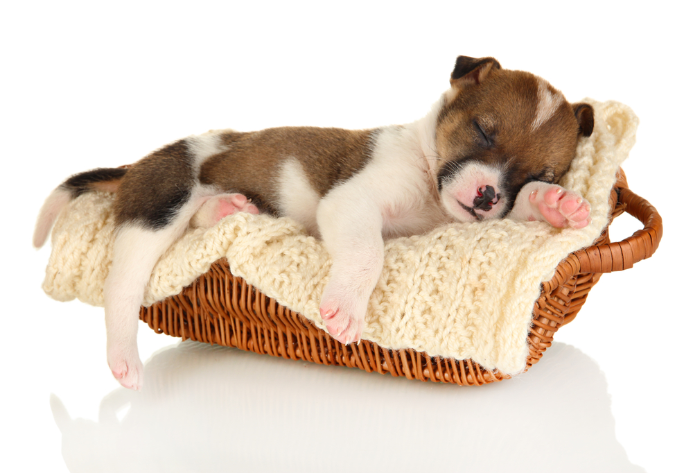 Beautiful little puppy sleeping in basket isolated on white