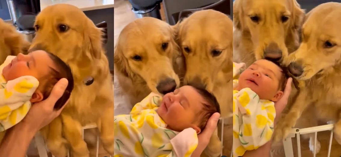 Meanwhile, Winston and Doug are a medium-sized British golden retriever breed. Reportedly, the breed is known for its gentle and loving nature. That nature is clear from this wonderfully heartwarming video of baby Miller and her two doggie brothers.