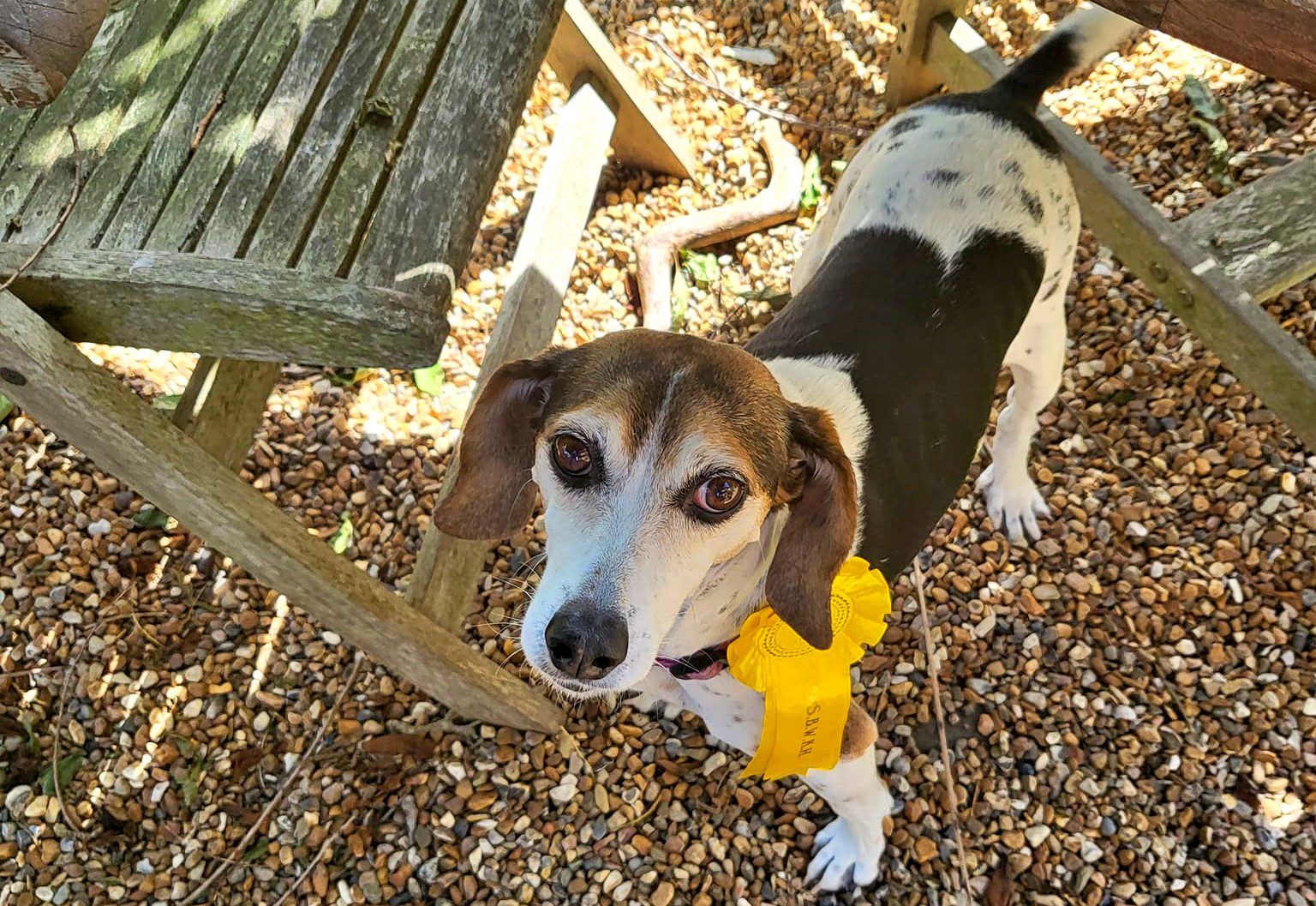 Bonnie, a beagle-mix rescue dog, escaped from home and went on an adventure. However, a man, who found her on his way to a dog show, took her with him, until he could track down her owner. Due to this, the proud pup ended up going home with a yellow rosette, after winning third place in a dog show.